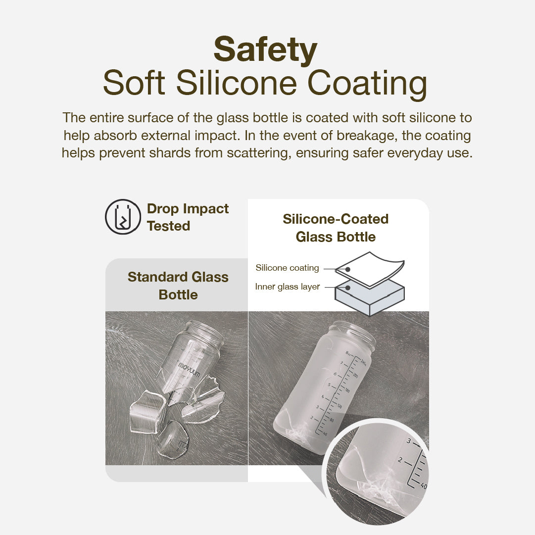 1. Safety Soft Silicone Coating: the entire surface of the glass bottle is coated with silicone. This cushions external impacts and in the event of accidental breakage, helps prevent glass fragments from scattering, ensuring safe use.